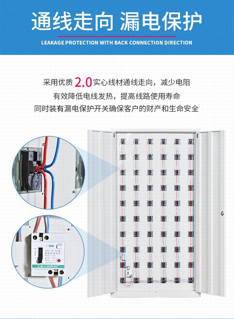 電源線全部采用2.5mm2實(shí)心線材,額定電壓為標(biāo)準(zhǔn)生活電壓220V,載荷電流為20A,負(fù)載功率為4400W。日常用手機(jī)充電功率為10-15W左右,可滿足290部(按15W計(jì)算)手機(jī)同時(shí)充電,而本手機(jī)柜可達(dá)到門數(shù)為100門,電源線材遠(yuǎn)遠(yuǎn)滿足充電需求;同時(shí)具有漏電保護(hù)功能,當(dāng)發(fā)生漏電時(shí),能夠及時(shí)將電源切斷,保護(hù)充電設(shè)備安全,需手動(dòng)復(fù)位方可通電,防止因漏電造成電子設(shè)備損壞。